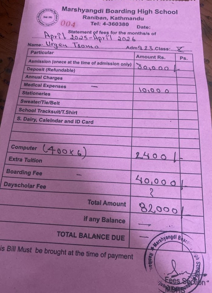 Platba školného v dubnu 2024 – začátek nového roku v soukromé škole v Kathmandu pro Urgent, Mingmara (Nawanga) a Koshilu.